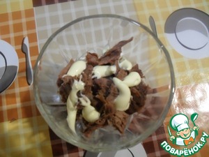 Следующий слой - вареное мясо. у меня - говядина. Но может быть и свинина и мясо птицы, не принципиально. Так же промазываем майонезом.