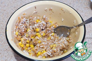 Слить лишнюю влагу из консервы, добавить в миску бОльшую часть натертой на терке моркови, добавить яичный белок, мелко порезанный лук, консервированную кукурузу.