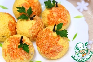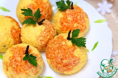 Из салата сформировать шарики диаметром 5-6 см. Шарики покрыть тонким слоем яичных желтков, сбоку добавить небольшой слой моркови, чтобы придать румянец яблочку. Воткнуть гвоздичку в салат-яблочко, из петрушки сделать листочки.