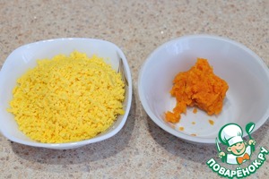 Яичный желток натертый на мелкой терке понадобится для оформления салата, также понадобится часть натертой на мелкой терке отварной моркови.