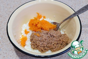 Морковь отварить, натереть на мелкой терке, отжать для удаления лишней влаги.
