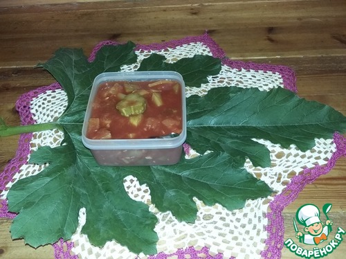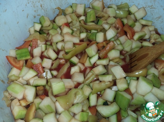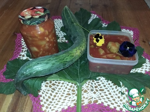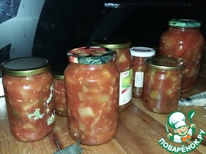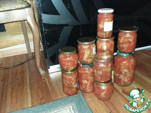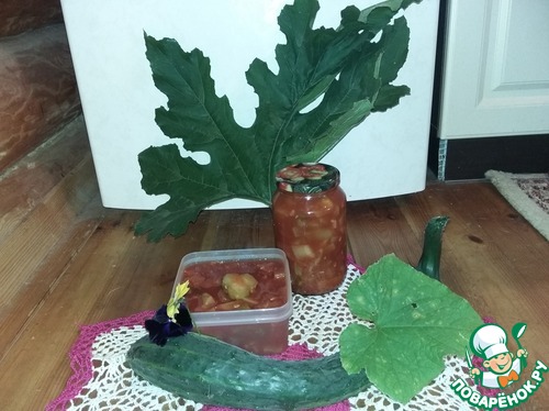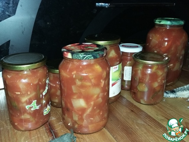 Не знал, куда пристроить кабачки. В этом году они удались на огороде на славу, в отличии от огурцов. Решил придумать какой нибудь салатик для заготовки на зиму. Результат превзошел все ожидания. А уж если это ещё постоит, то думаю будет что-то. Делал вчера, остатки остыли- отправил их в холодильник, а сегодня попробовали всей семьёй, и всем очень понравилось, да что там понравилось. Оставался примерно литр, хлебом контейнер вылизывали все. Немного напоминает лечо, вероятно из-за перца и сока, но свой вкус. И спасибо большое LNataly за идею с томатным краснодарским соусом. Он придал свой ароматный вкус. Попробуйте и приятного Вам аппетита.