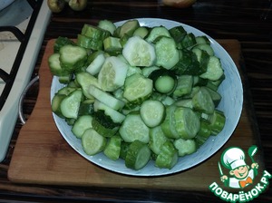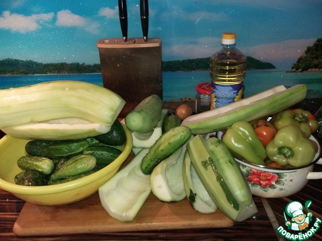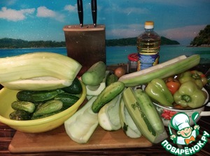 Собираем все овощи и составляющие в кучу. Кабачки чистим от кожи и семян. Крупные огурцы очищаем от кожи то же.