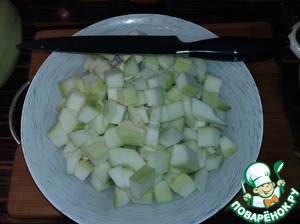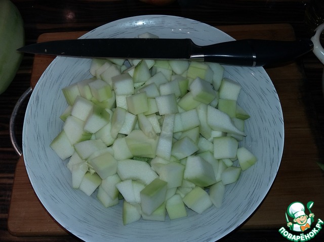 Нарезаем кабачок кубиками примерно 3 на 3 см.