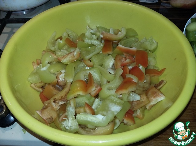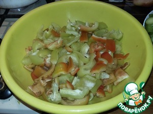 Перец нарезаем кубиками примерно 2-3 см. Ну кто как любит можно и полосками.