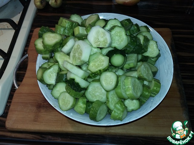 После 20-25 минут кипячения добавляем огурцы и сразу добавляем соль и сахар. Кипятим еще 10 минут и после этого вливаем уксус, соус и мелко порезанный чеснок, естественно все периодически перемешивая кипятим еще 5 минут.