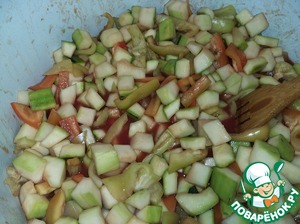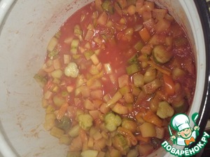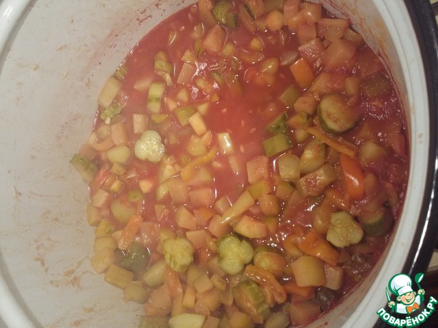 Засыпаем нарезанный перец и кабачок в кастрюлю и заливаем томатным соком. Ставим на огонь и ждем пока закипит. Кипятим минут 20-25 периодически помешивая, чтобы томатный сок не подгорал. Да и ещё момент если сок достаточно густой, разбавьте его немного водой.