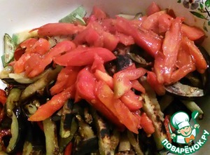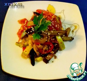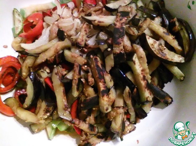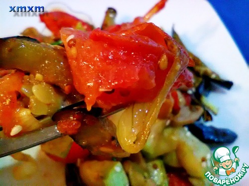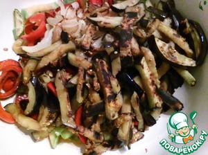 Выжав осторожно, чтоб не разломать, баклажаны, обжариваем и добавляем к остальным овощам.