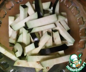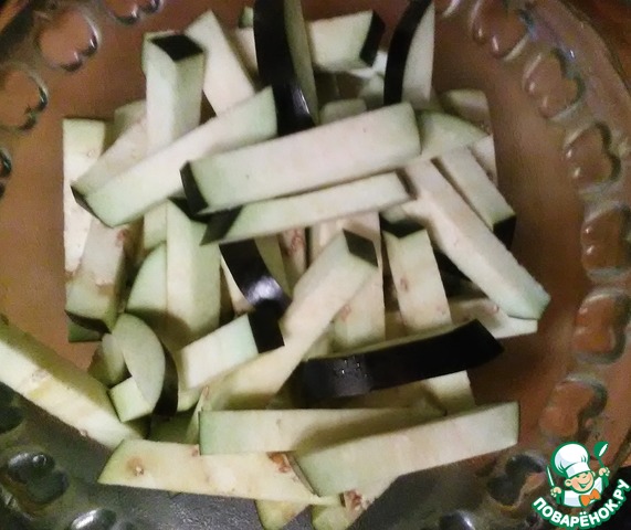 Сначала нарежем баклажан соломкой и посолим щепоткой соли, чтоб стек сок и ушла горечь. Отложим его в сторонку.