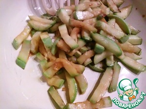 Нарежем кабачок, так же соломкой и обжарим на среднем огне в минимальном количестве масла, до золотистого цвета.