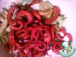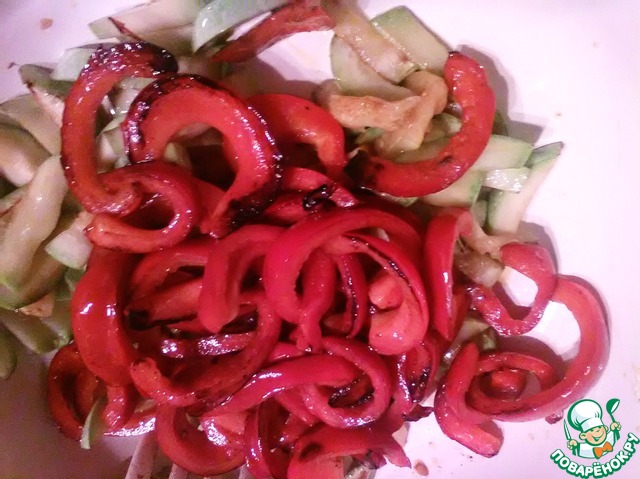 Далее нарежем перец ( в моем случае гогошары) дольками и так же обжарив складываем к кабачкам.