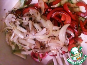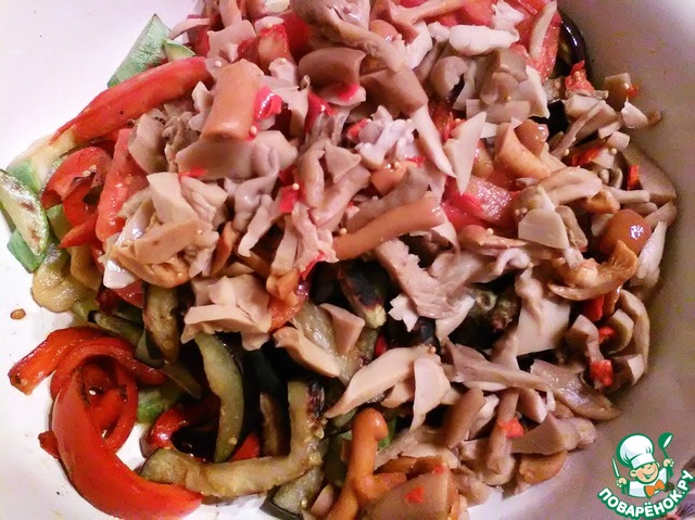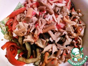 Грибы выжимаем от лишнего маринада и добавляем к овощам.