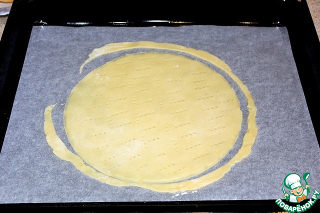 Тесто раскатать в колбаску, разрезать на 6 равных частей. Блюдо с кусочками теста затянуть пищевой пленкой и отправить в холодильник примерно на 30 мин.