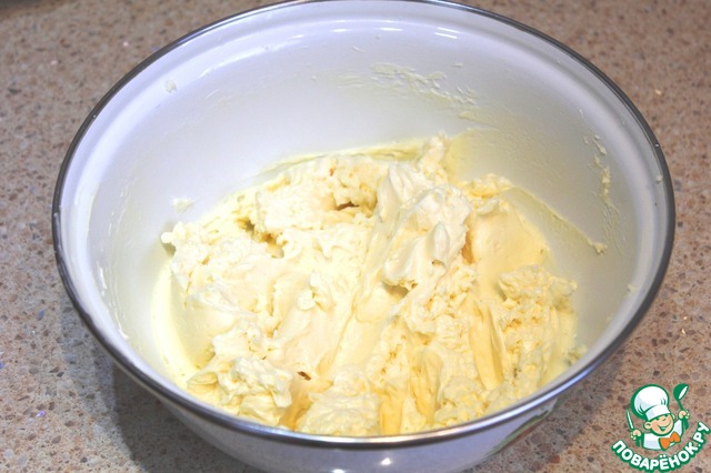 Сливочное (300 гр.) взбить. Продолжая взбивать, порциями добавить сгущенное молоко.