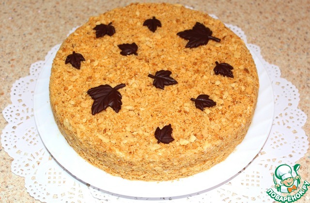 Крем готов. Приготовленным кремом прослоить коржи. Поверхность торта и боковые части посыпать измельченными в крупку обрезками от выпеченных коржей.