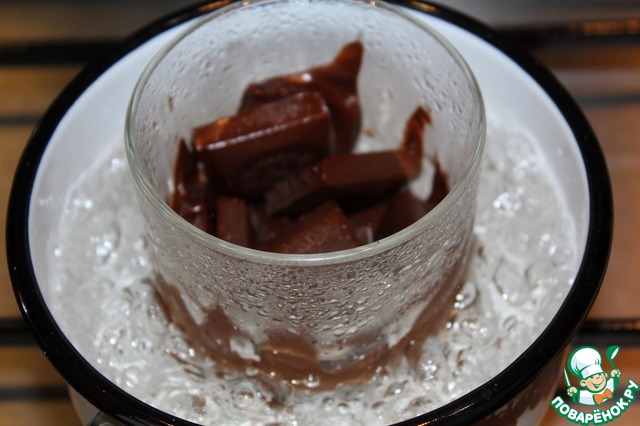 Прежде чем приступить к выпеканию коржей, приготовим украшения для торта. Их следует поместить в морозильную камеру для застывания. Пока выпекаем коржи, наши листочки из шоколада будут готовы для оформления тортика. Итак, шоколадные кубики растопить на водяной бане.
