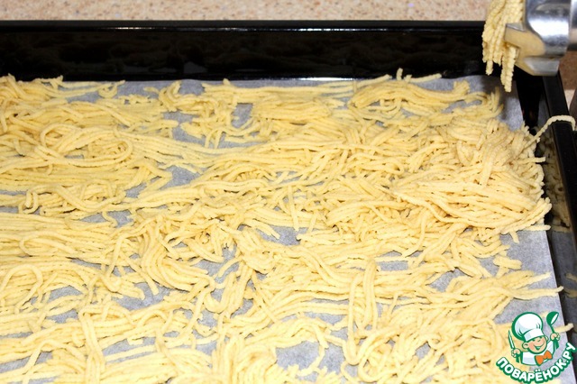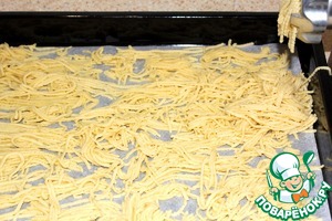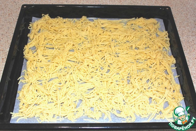 Соломку из теста распределить ровным слоем на пекарском листе. Предварительно пекарский лист застелить пекарской бумагой. Отправить в духовой шкаф для запекания. Запекать до золотистого цвета.