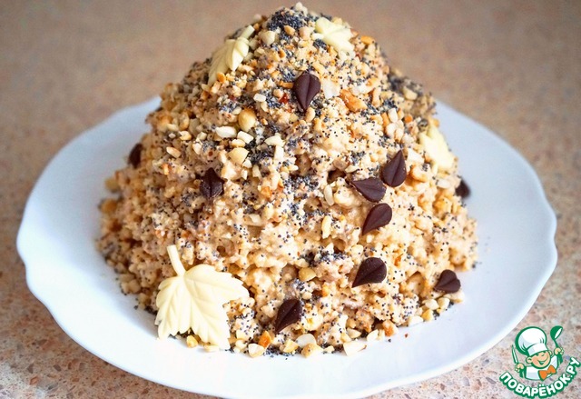 Соединить крошку печенья и приготовленный крем. Выложить на плоское блюдо, сформировать горку. Посыпать крошкой жаренного арахиса и маком.