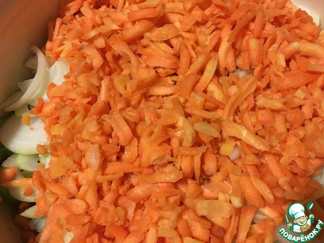 Все укладываем в кастрюлю и добавляем соль, оставляем на 10-12 часов.