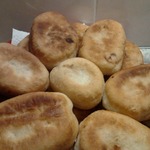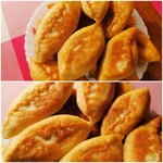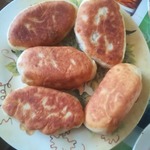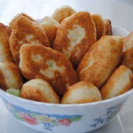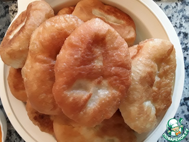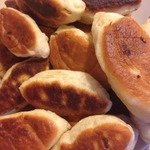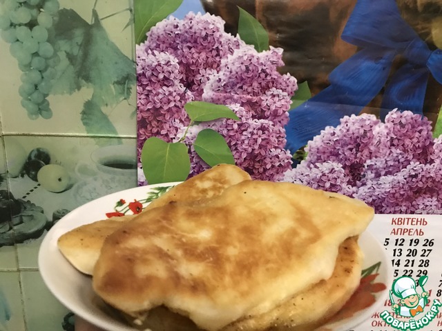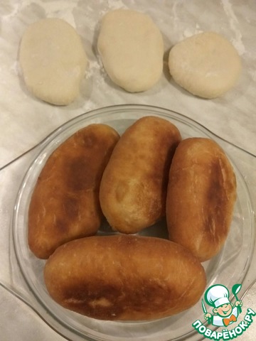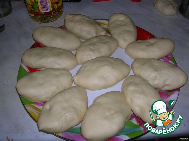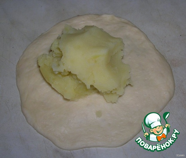 После этого я разделила тесто на небольшие шарики (у меня получилось 30 шт). Каждый шарик я разминала прямо нас толе в лепешечку (у меня тесто к столу не прилипало, но если у кого-то с этим могут возникнуть проблемы, то можно смазать стол или пластиковую доску растит. маслом), клала на середину лепешки начинку (я делала с картошкой и с капустой) и защипывала края.