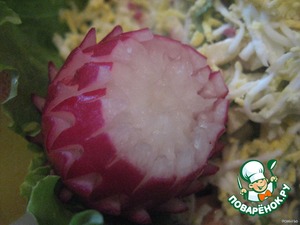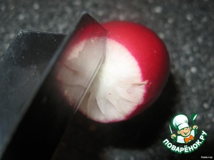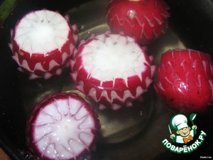 Положить редис в холодную воду, чтобы "лепестки" раскрылись.