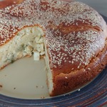 Форму застелим пекарской бумагой, выльем 1/2 часть теста. Выложим ровным слоем начинку и выльем вторую часть теста. Поставим в заранее разогретую до 180 С духовку на 40-50 минут, проверяем на сухую шпажку.