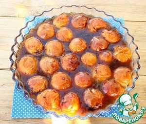 В форму, d=26 см, аккуратно выкладываем абрикосы срезами вниз. Выливаем в форму карамель, если карамели будет много, то влейте 2/3 от общего количества.
