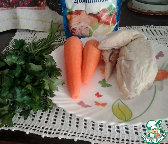 Отварить куриную грудку в подсоленной воде до готовности. Почистить морковь, зелень помыть и обсушить.