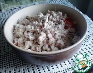 Куриную грудку мелко нарезать поперек волокон и добавить к моркови.