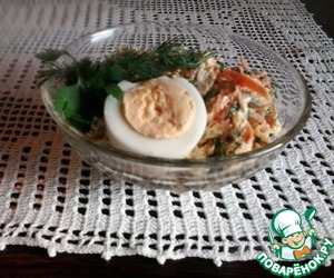 Подавать можно порционно, украсив отварным яйцом и веточками петрушки и укропа. Салат сытный, можно даже подать не как закуску, а на второе, например, к отварной картошке в качестве мясного блюда. Готовьте с удовольствием! Приятного аппетита!