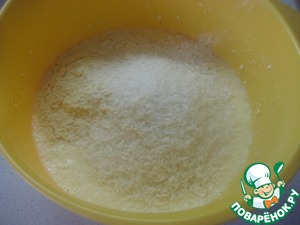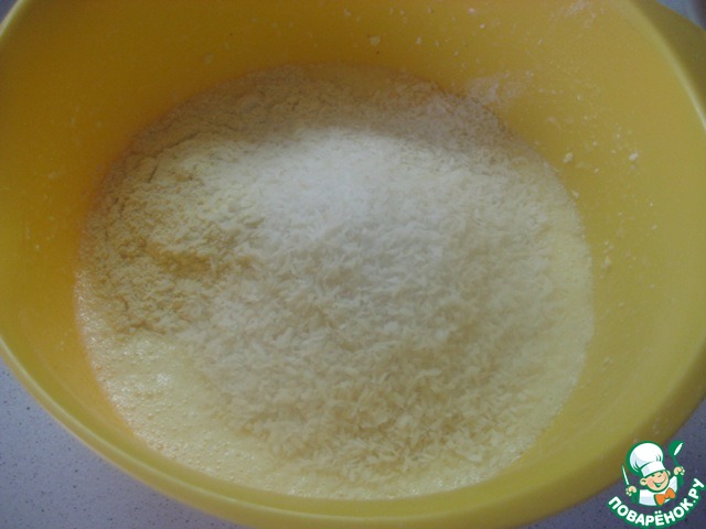 Всыпать кукурузную муку, кокосовую стружку, соль, ванильный сахар и разрыхлитель теста. Хорошо перемешать до однородности. -