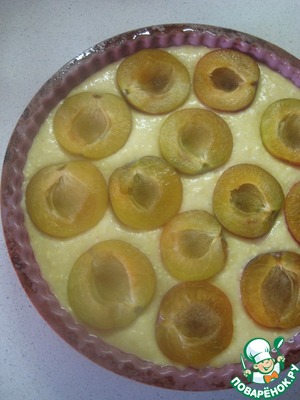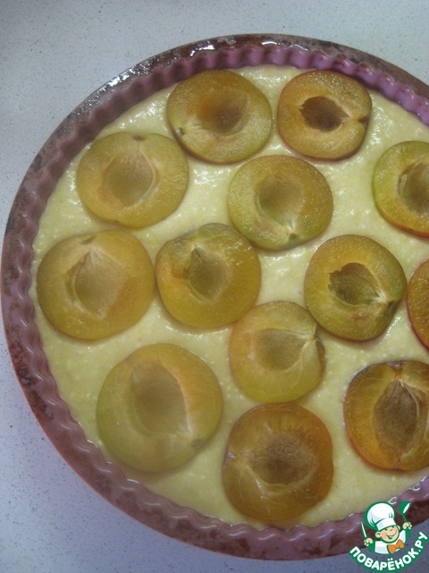 Вылить тесто в форму для выпечки (диаметр 20 см), разровнять. Сверху выложить половинки слив кожицей вниз.