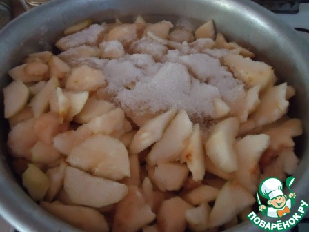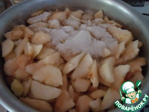 Засыпать сахаром, слегка потрясти, чтобы распределить сахар. Можно оставить, чтобы груши пустили сок. Я поставила вариться сразу, на небольшой огонь. Когда появился сок, нагрев увеличила.