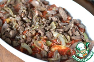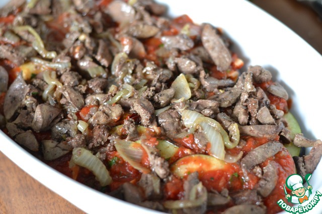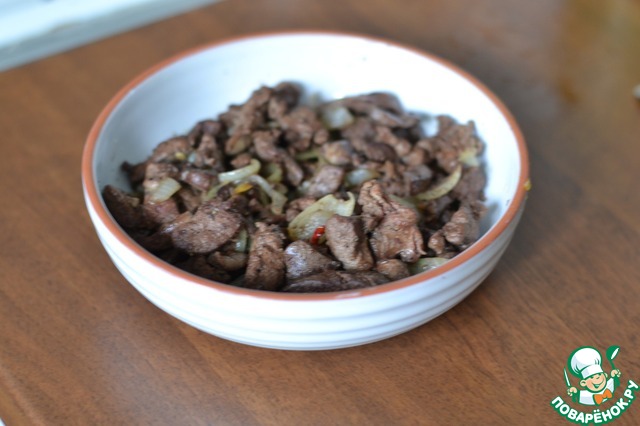 Куриную печень помыть, нарезать на кусочки и обжарить с нарезанным луком на подсолнечном масле. Используем 1 луковицу.