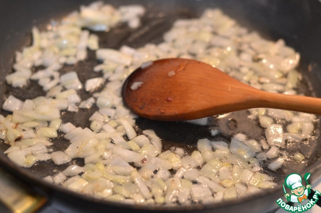 2-ю луковицу мелко нарезать и обжарить на подсолнечном масле до стеклянного состояния.