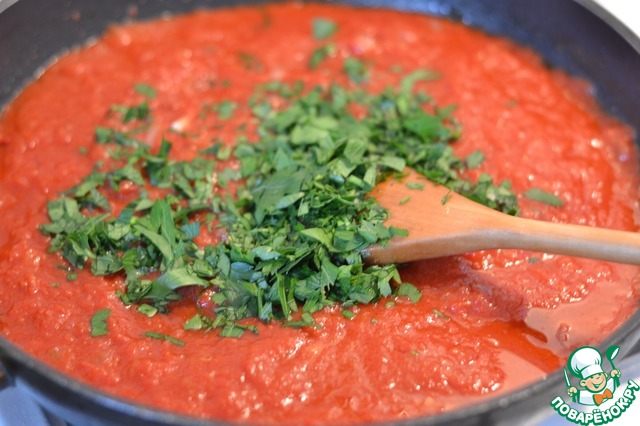 Петрушку мелко нарезать. Половину добавить к томатному соусу.