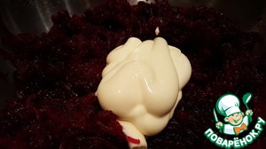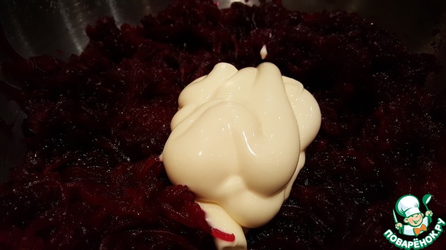 Почистить остывшую свеклу и натереть на мелкой тёрке. Я использовала тёрку для моркови по-корейски. Если в миске будет лишний сок от свёклы, лучше его слить. Добавить майонез и чеснок, пропущенный через чеснокодавку.
