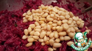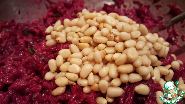 Добавить горсть кедровых орехов. Так же хорошо подходят к свёкле рубленые грецкие орехи. Хорошо перемешать. Я не солила свёклу дополнительно, мне хватило соли в майонезе и в сулугуни.