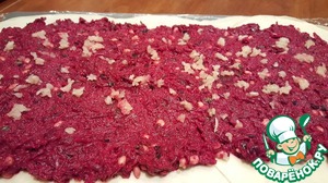 Выложить на середину блинчиков свекольный салат, отступить с обеих сторон. На фото чеснок сверху, т. к. долго рассуждала класть его или нет... рулет готовила к завтраку...