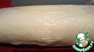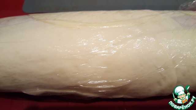 Помогая себе пищевой плёнкой скрутить рулет. Если нужен рулет для праздника лучше положить поменьше начинки. Так рулет будет аккуратнее. Замотать рулет пищевой плёнкой и убрать в холодильник. Я убрала на ночь.