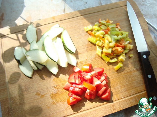 Режем овощи произвольно. Кабачок-пластинами тонкими, перец и помидоры-мелким кубиком.