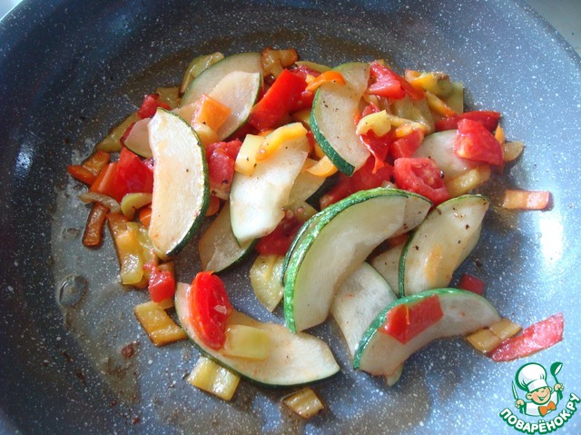 В оливковом масле обжариваем пластины кабачка, выкладываем перец и помидор и чуть томим-минут 5. Солим и перчим по вкусу.