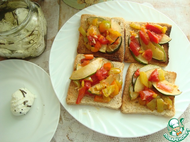 Подсушенный хлеб на гриле, в духовке или в тостере с овощами чуть обжаренными в оливковом масле и чесноком.