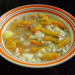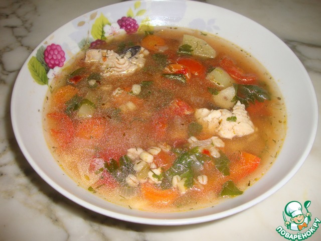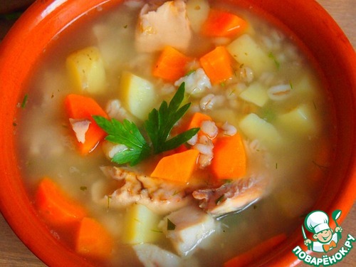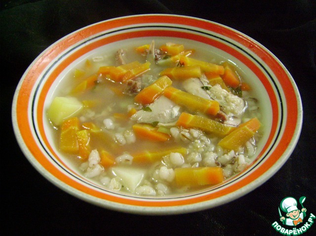 Указанные продукты рассчитаны на кастрюлю 4 - 5 литров. Накануне приготовления замочить перловую крупу в холодной воде. Начиная готовить суп, первым делом в отдельной кастрюле сварить перловку до готовности, откинуть на дуршлаг.