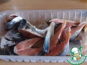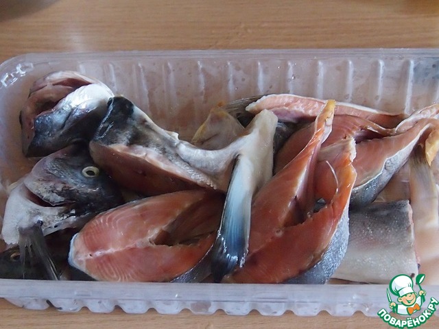 Для приготовления бульона я использовала остатки от лосося, головы от других рыб. В принципе, рыбу можете положить какую угодно.