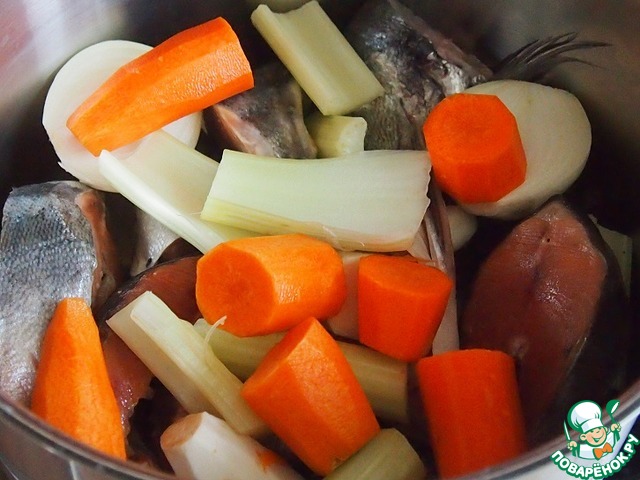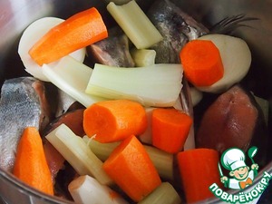 Добавить к рыбе крупно нарезанные морковь, черешки сельдерея, корень петрушки, лук. Залить холодной водой, после закипания варить на небольшом огне до готовности.