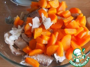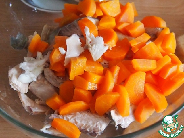 Из рыбы, что осталась от приготовления бульона, удалить кости. Мясо от рыбы и вареную морковь, нарезанную кубиками или кружочками, сложить пока в мисочку. Остальные овощи выбросить.