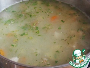 Зелень петрушки мелко нарезать, добавить в кипящий суп и сразу выключить огонь. -