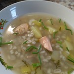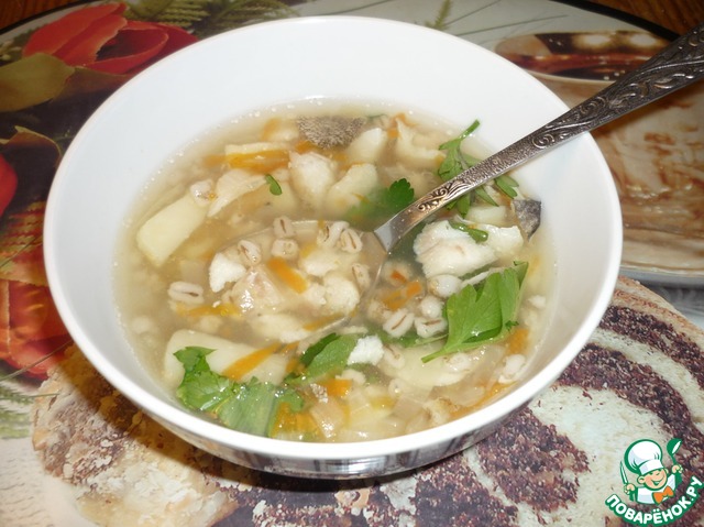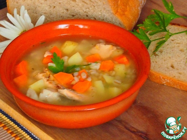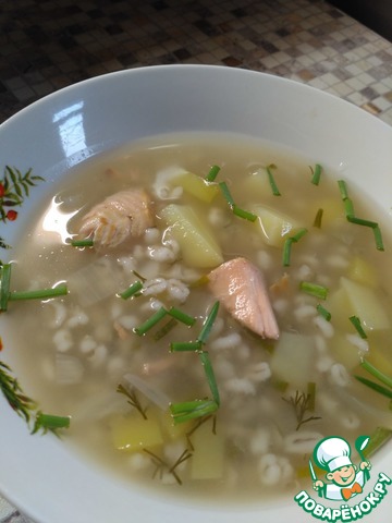 Как только будут готовы картофель и рыба, добавить в кастрюлю перловку, мясо рыбы и морковь от бульона, варить пару минут. Посолить по вкусу.