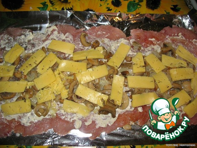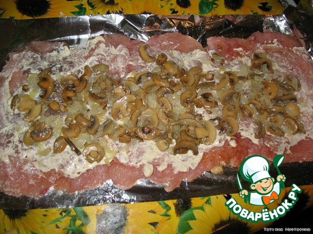 Сверху выложить слой грибов (я предварительно их поджарила с луком).